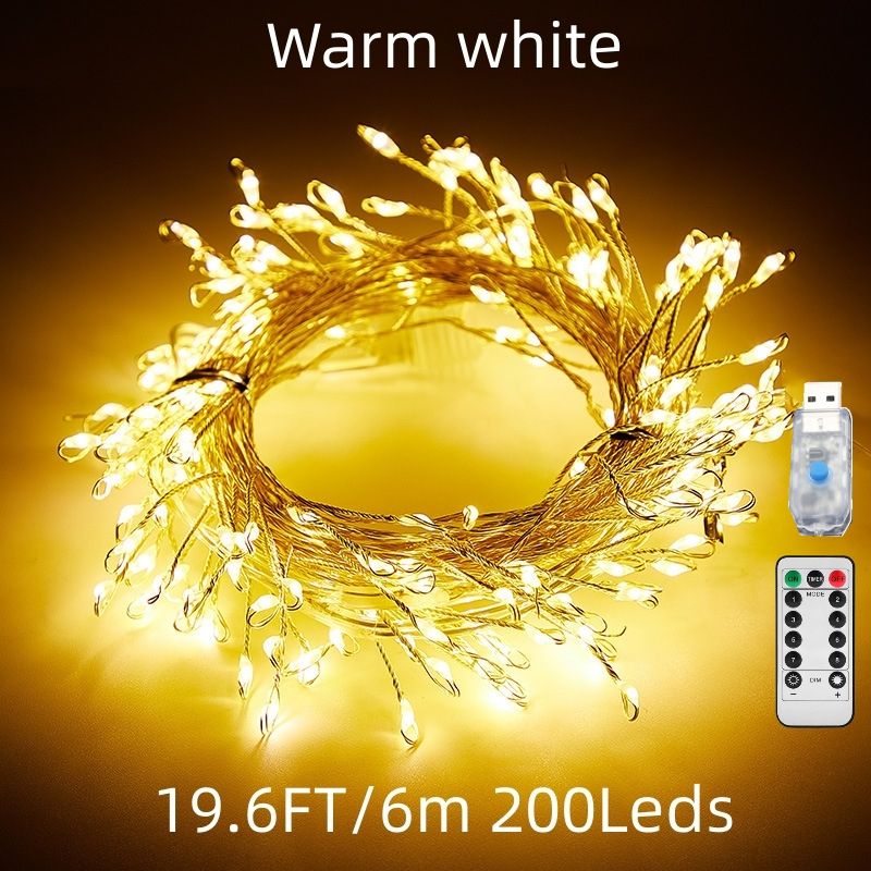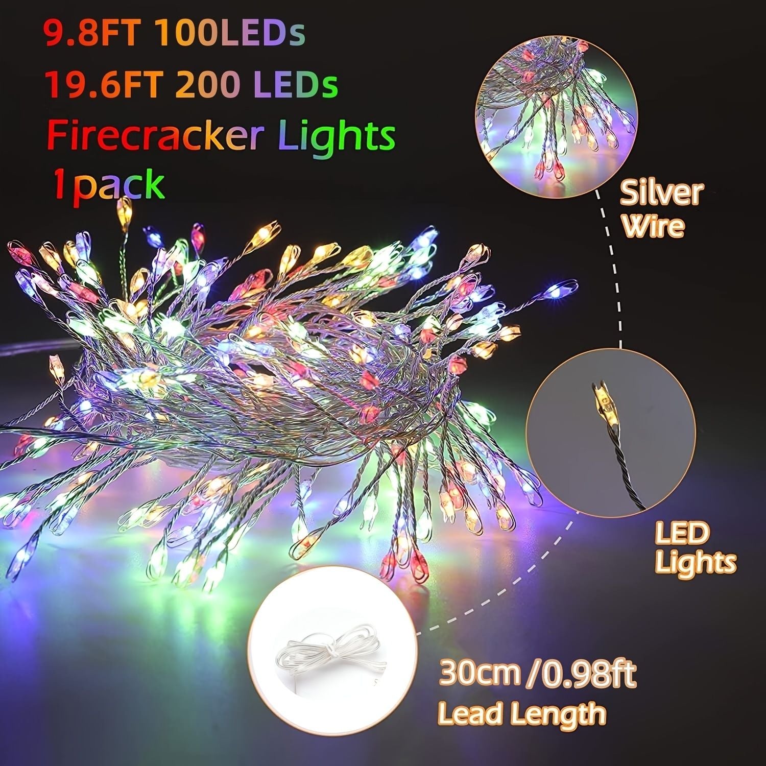 LED Fairy Light Firecracker String Lights Light Color: Warm white / Multicolor String length: 9.8ft/3m 19.6ft/6m Lead length: 30cm/0.98FT Number of LEDs: 100leds/200leds String Light Color: Silver Wire Light Control method: 8 modes USB+remote control