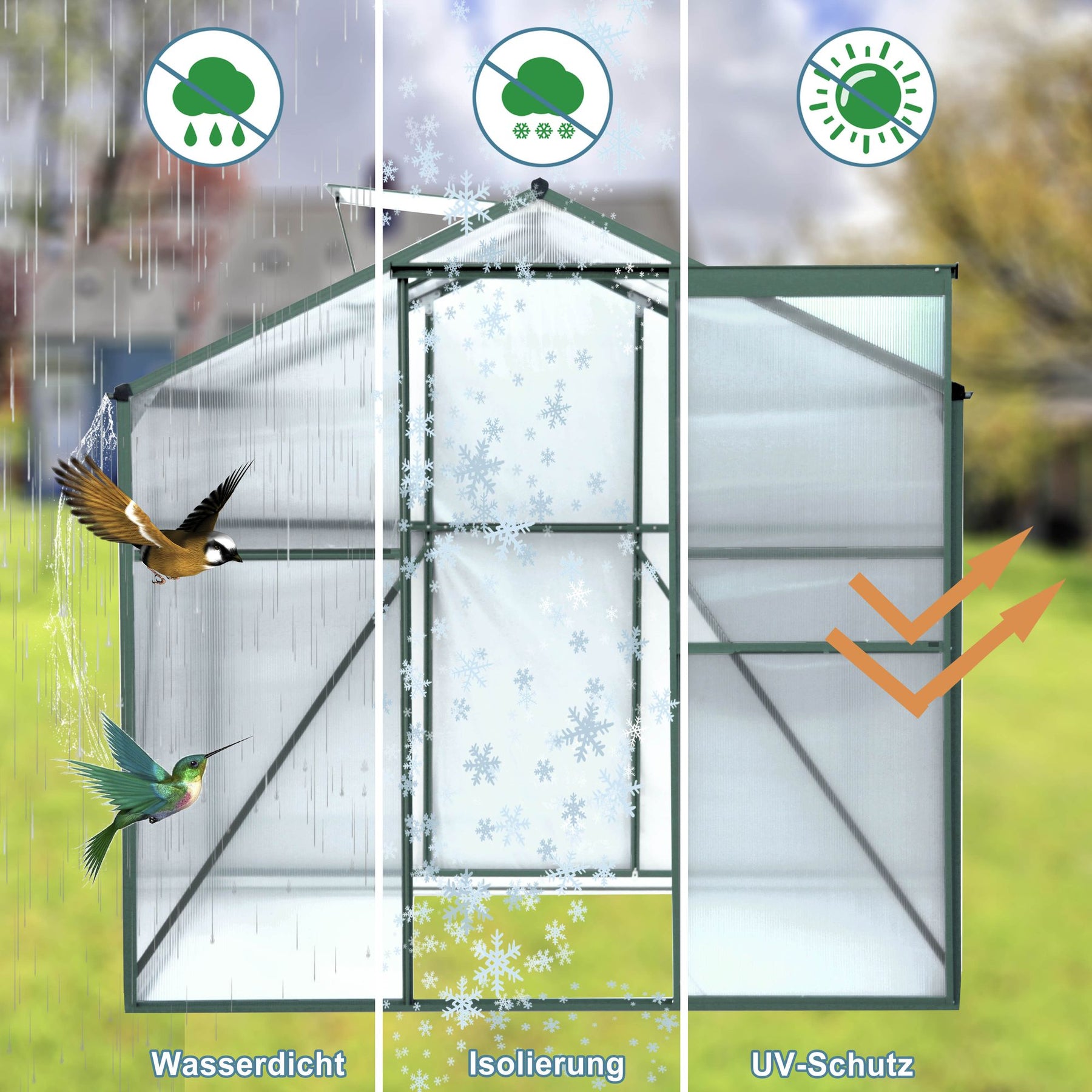 This robust greenhouse consists of strong 4mm clear polycarbonate panels that allows enough sun to pass through but will protect plants from the weather, and is therefore both UV-resistant and thermally insulated. It thus ensures a high temperature and increased humidity inside. The greenhouse has a stable and maintenance-free aluminium structure that ensures additional stability. The rain gutters allows efficient water drainage .The roof opening ensures optimal ventilation on hot days. The greenhouse is also complete with a sliding door that allows for easy access.
