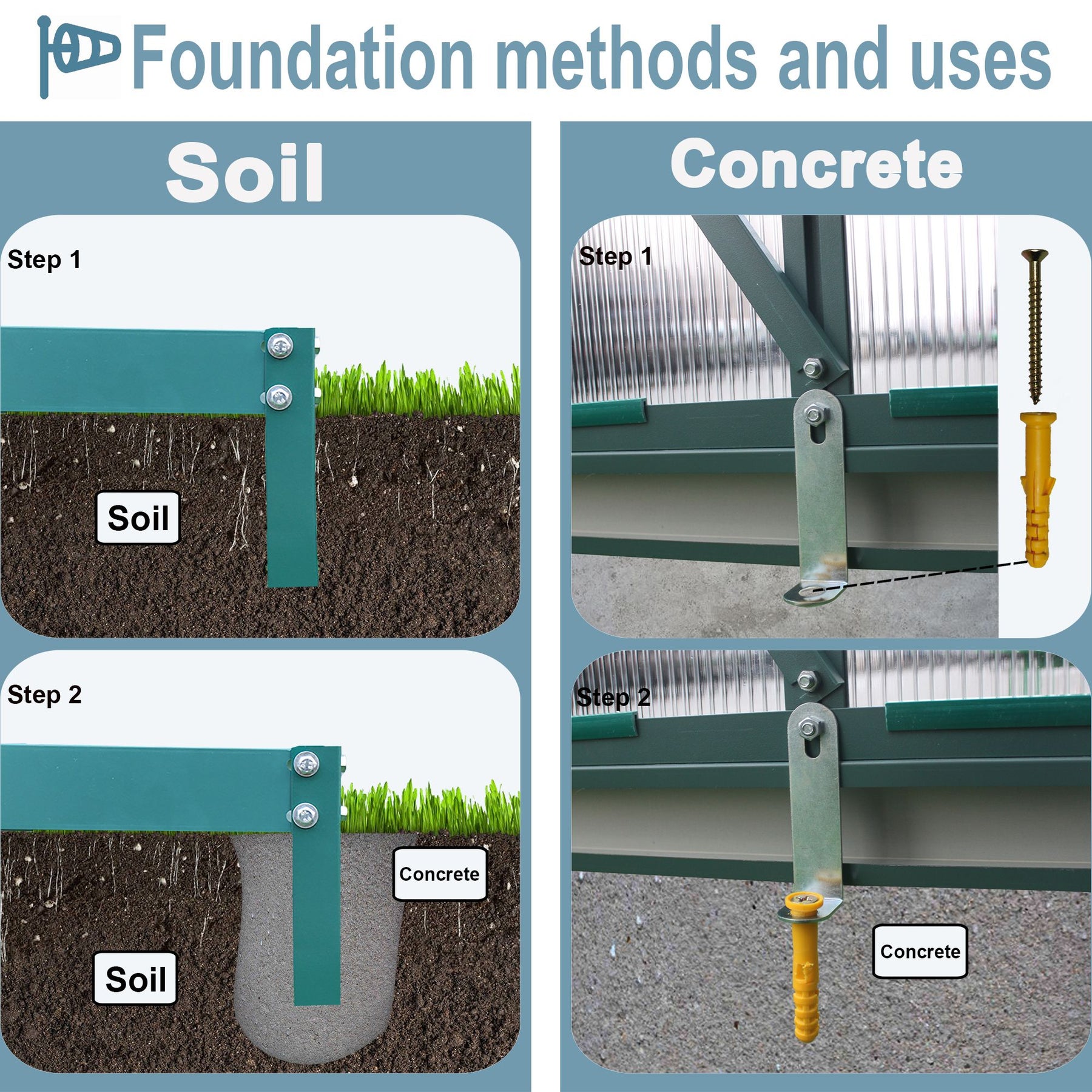 The product can be fixed not only into the soil, but also into the concrete, and is equipped with connecting parts and expansion screws. The 4mm twin wall panel and polycarbonate sheets provide ultimate insulation and UV protection. The installation method of the panel is to insert the aluminum alloy U-shaped groove, and completely wrap it to make it more stable.