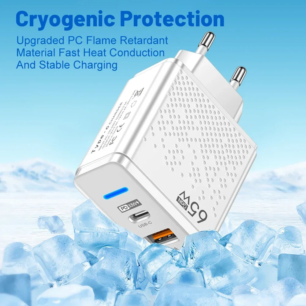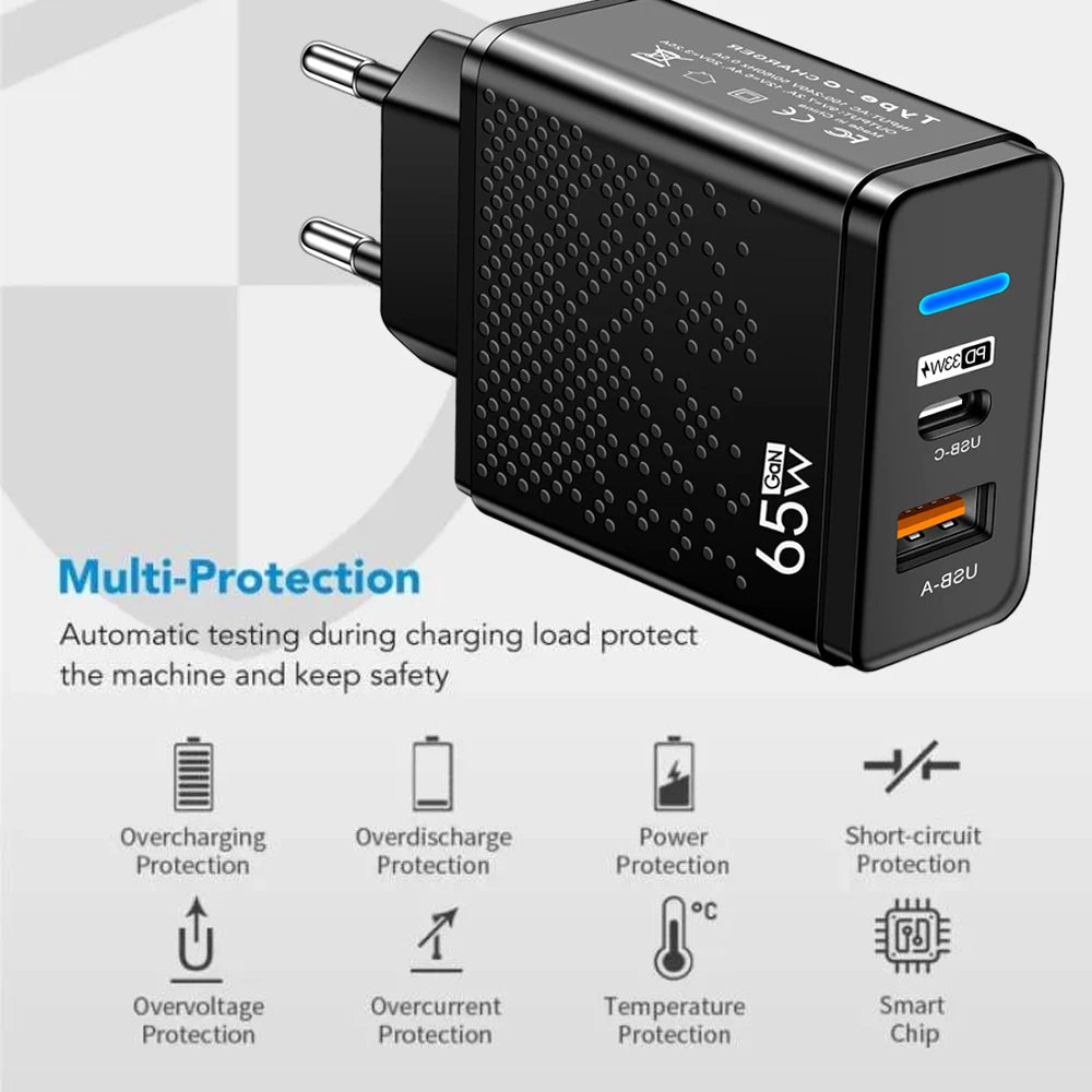 Charge all your favorite devices with one compact, high-powered solution. This 65W USB & Type-C wall adapter is built for speed and safety, offering multi-device compatibility and intelligent protection — ideal for iPhone, Samsung, Xiaomi, Google Pixel, and more.