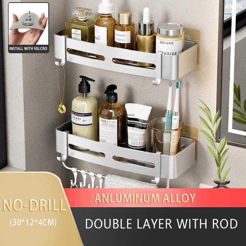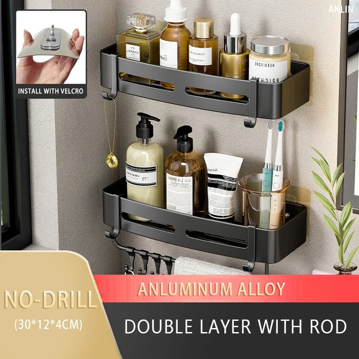 Elevate your bathroom or kitchen organization with our innovative Bathroom Shelf. Designed for convenience and style, this wall-mounted, dual-tier storage rack provides the perfect solution for storing shampoo bottles, toiletries, or kitchen essentials without the need for drilling.