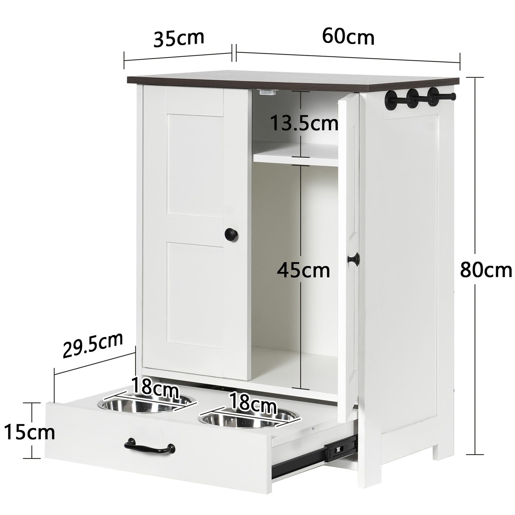 Designed for pet parents who value organization and a tidy living space, this Dog Feeding Station is a white, space-saving cabinet that combines a mealtime station, food storage, and handy storage for collars, leashes, and toys. It’s ideal for households with medium-sized dogs who want a clean, organized feeding area without clutter.