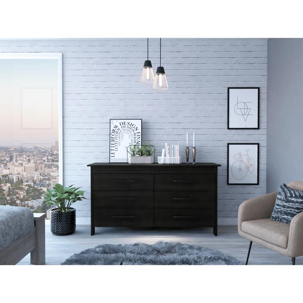 The Seul 6-Drawer Chest adds contemporary flair to your bedroom. Thanks to its six spacious and efficient drawers; they offer an excellent solution for storing accessories such as shirts; jeans; underwear; caps; and other items.It has a surface designed for photographs; consoles; lamps; and accessories that you want to use to complement a beautiful decoration in your bedroom.This clean-lined double dresser brings your bedroom or guest room into the 21st century by offering virtual storage space. Made in Colombia; this economic piece features six very spacious drawers (7.5" high x 26.8" wide) that will provide you with plenty of hidden space; each drawer comes with black metal pulls for a modern touch; roller glides; and all-metal hardware for smoother; longer-lasting drawer operation. A neutral finish gives this design the versatility to blend with any color palette you dream up.The top table (58W x 19" D) is perfect for placing decorative items or even a flat-screen TV.This product stands on four legs with a 3.8" clearance that will help you clean and reach underneath it.Overall product dimensions are 58W x 19 "D x 31.7 "H. White Finish