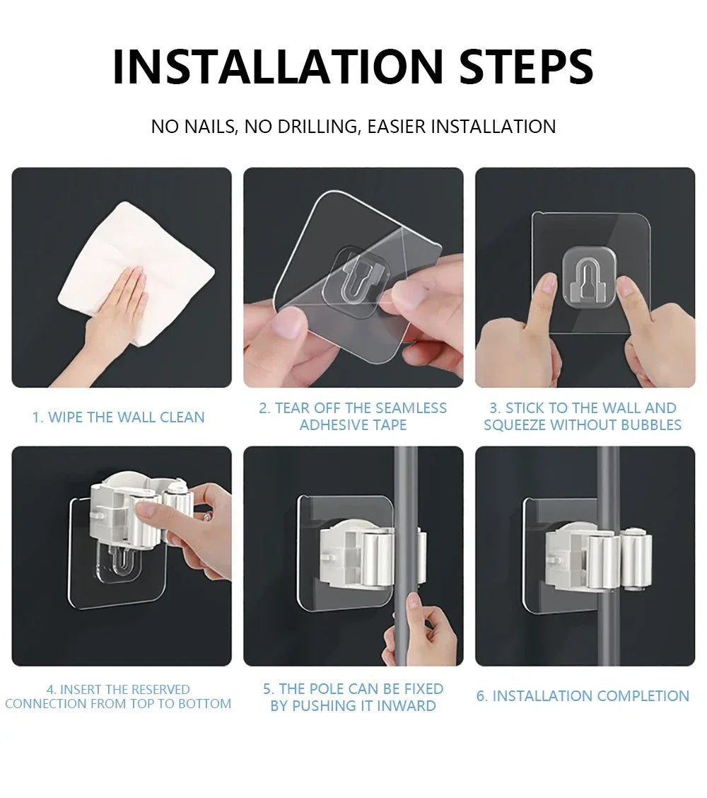 - Durable & Sturdy: Our mop holder is made from premium ABS and PVC materials, ensuring a strong adhesive grip that won't drop off easily.