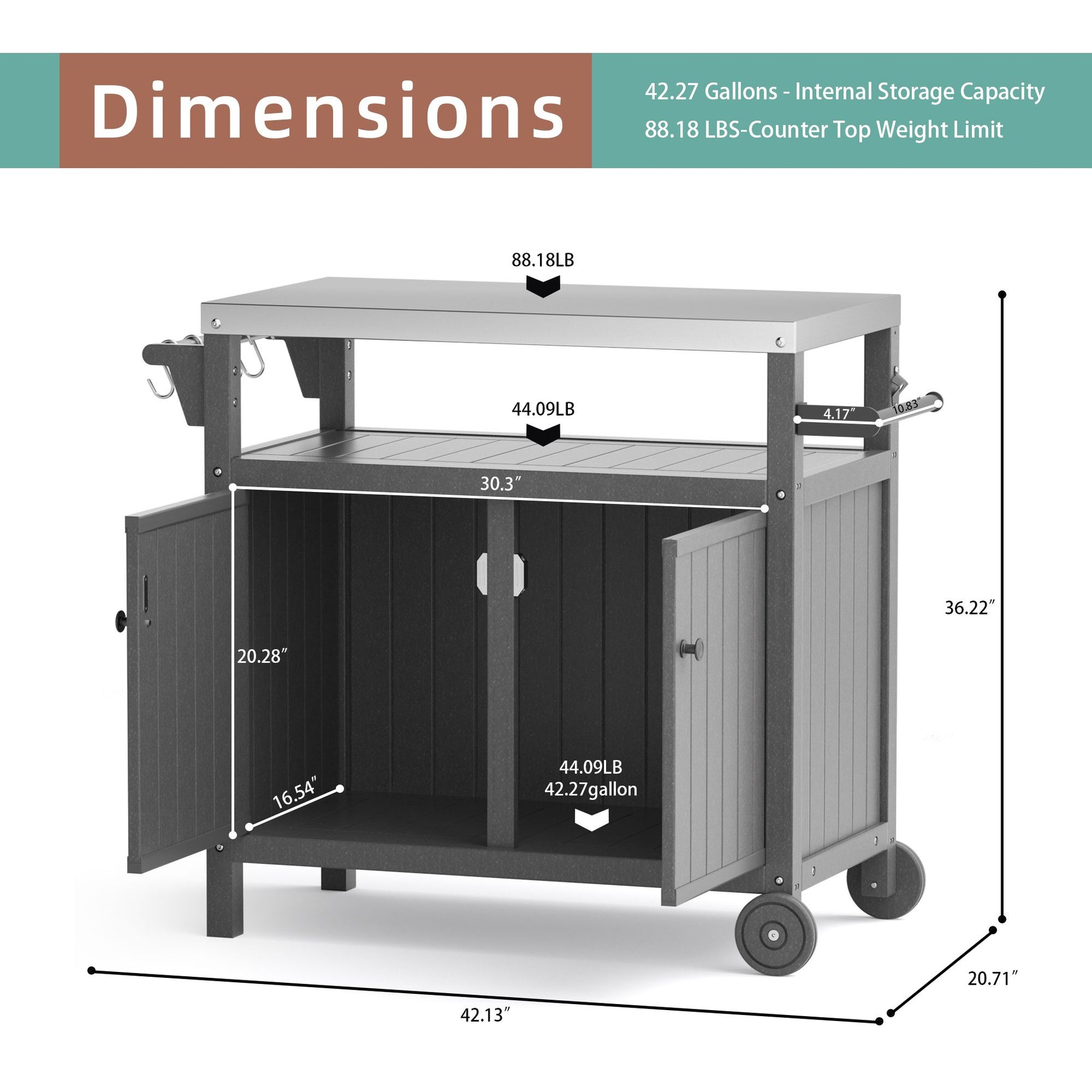 [SHELVES FOR STORAGE ] Outdoor grill cart for Big Size: 42.12 in. W x 20.71 in. D x 36.22 in. H .43.4 gallons of interior storage is ideal for storing barbecue accessories, food preparation, drinks or party items;