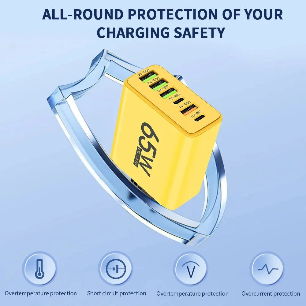 Upgrade your charging game with this 6-Port Universal USB Charger, designed for families, offices, and multi-device setups. With 2 USB-C and 4 USB-A ports, this 65W fast wall charger powers up phones, tablets, and accessories at once—quickly and efficiently.